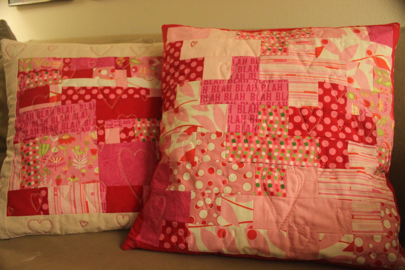 I have to say, I've seen these cross pillows on Flickr, and they kind of intimidated me. But the instructions were super easy, and it came together rather quickly! I did more of the heart quilting - mainly to tie the two pillows together, but also because it really is a fun way to quilt something, and I don't know what else I would ever make that would call for it.